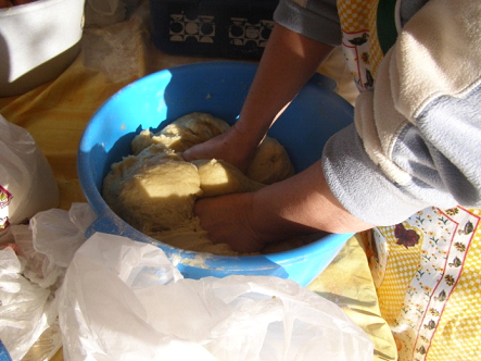 Amb el minipímer es mesclen ben mesclats l’oli , l’aiguardent i el moscatell fins que la barreja tinga una textura uniforme. A continuació hi anem afegint farina i pastant fins que no n’admeta més. S’ha de pastar molt bé, pastant i trencant la pasta fins que estiga ben fina.