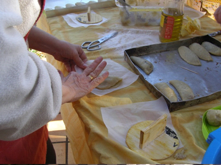 Les boletes, les posem damunt d’un trosset de paper encerat i les fem planes, com una coqueta molt fineta (podem fer-nos un motle de fusta de la mida que vulguem els pastissos, perquè ens isquen tots igualets). Hi posem una culleradeta de confitura, dobleguem el paper per la meitat, llevem la pasta que sobre, i igualem el pastís. Abans d’enfornar-los, els pintem amb ou batut i els ensucrem.
